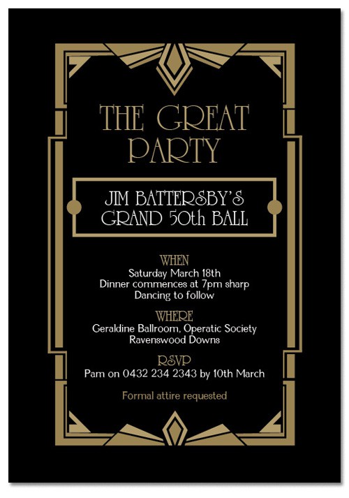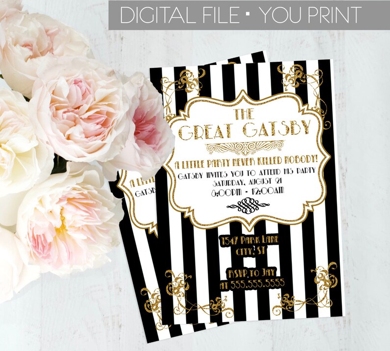 Party like gatsby with these black and gold great gatsby birthday party decorations. Please add invitation wording in the notes shop bridal shower honoring, great gatsby style, pink invitation created by greatgatsby_artdeco. Modern, floral, vintage, we've got party invitation styles to suit everyone's vibe. Get the details on how to turn your initials into gatsby gold after the break.